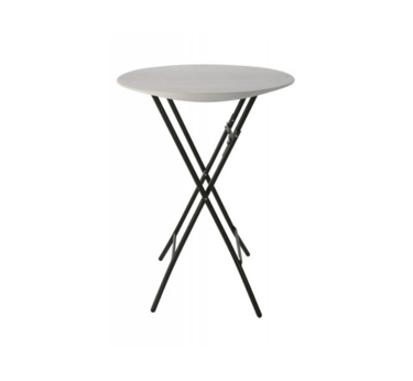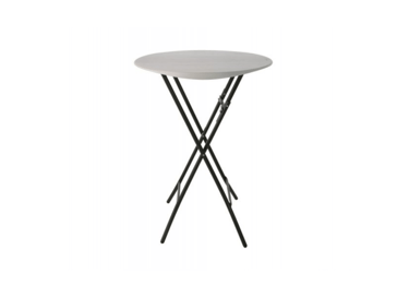Bílý barový stolek o průměru 80cm. Díky malé hmotnosti a použitým materiálům se s ním lehce manipuluje.