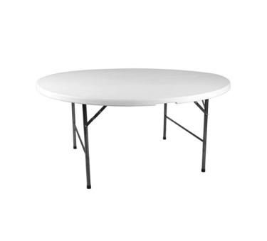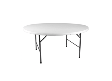 Bílý stůl s průměrem 180cm a výškou 76cm vhodný pro vnitřní i venkovní použití. Možné přiobjednat speciální kulaté ubrusy.