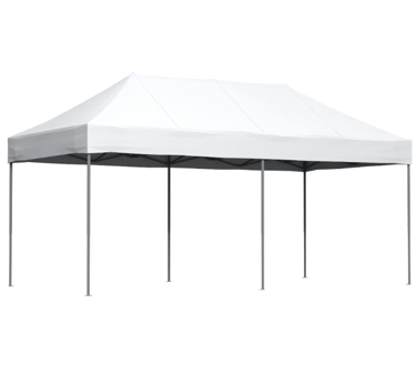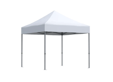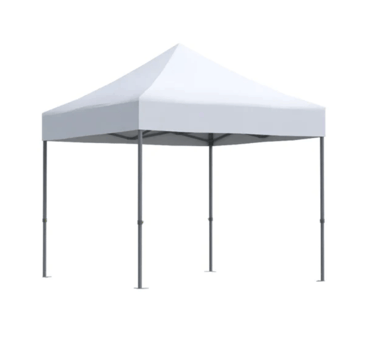 Bílý stan s pevnou konstrukcí na bázi nůžkových stanů. Velkou výhodou je lehká manipulace.