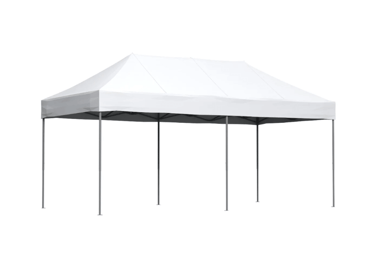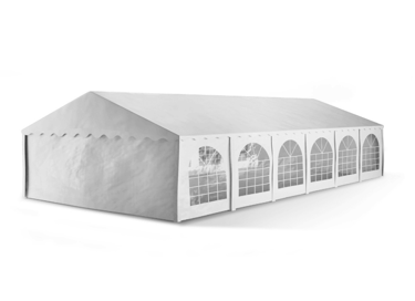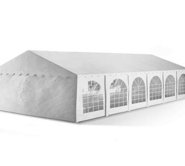 Bílý stan se zpevněnou konstrukcí. Prostor je plně uzavíratelný. Spojením stanů je možné vytvořit prostor až 144m2.